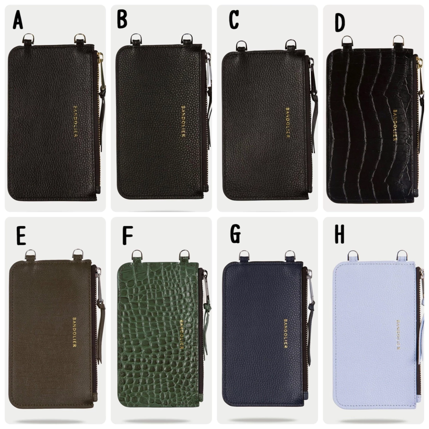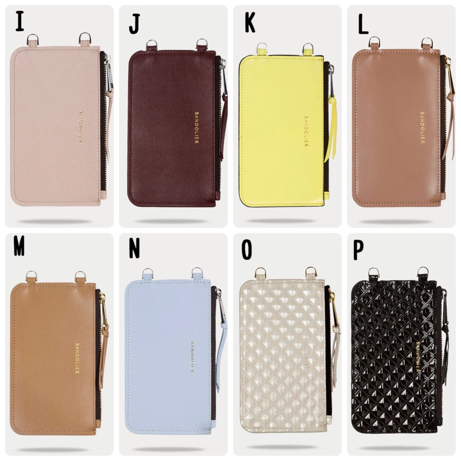 | Model | A. Black/Gold x ONE SIZE, B. Black/Silver x ONE SIZE, C. Black/Pewter x ONE SIZE, D. Black/Croc/Gold x ONE SIZE, F. Green/Croc/Pewter x ONE SIZE, G. Navy/Silver x ONE SIZE, H. Periwinkle/Silver x ONE SIZE, I. Sand Rose/Silver x ONE SIZE, J. Wine/Silver x ONE SIZE, K. Bright Yellow/Silver x ONE SIZE, L. Warm Taupe/Gold x ONE SIZE, N. Light Blue/Navy/Silver x ONE SIZE, O. Cream Embossed/Gold x ONE SIZE, P. Black Embossed/Pewter x ONE SIZE |