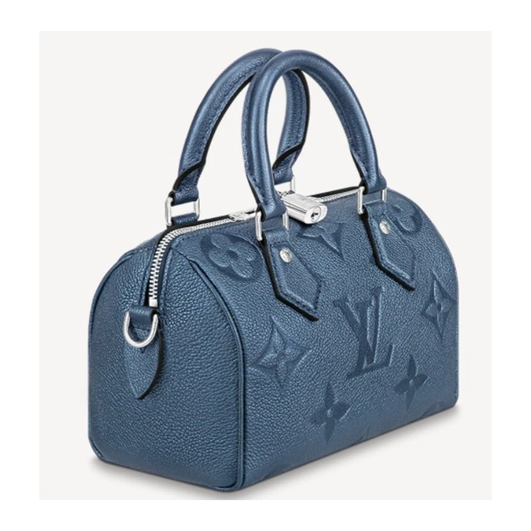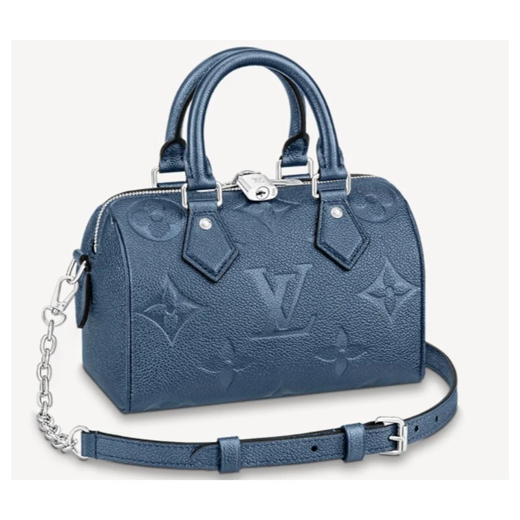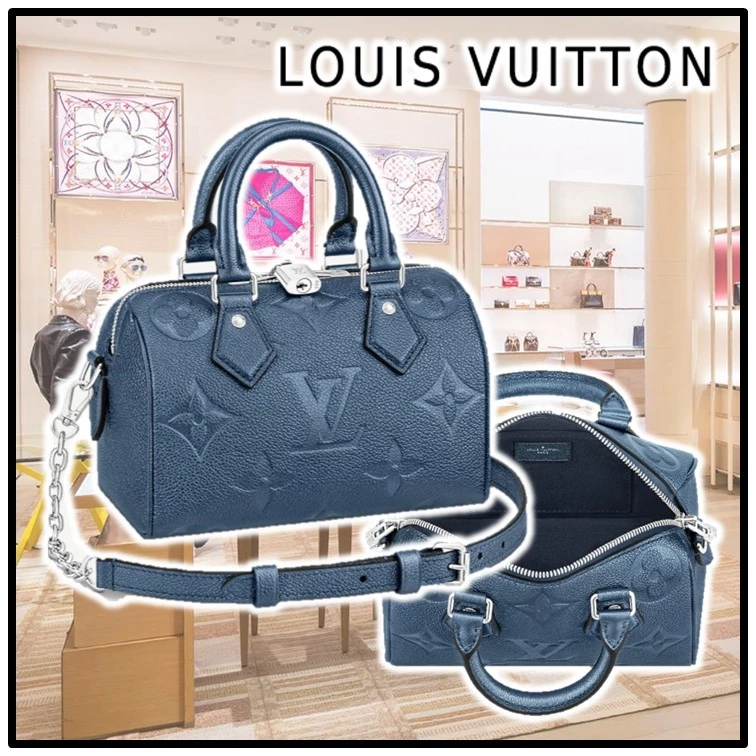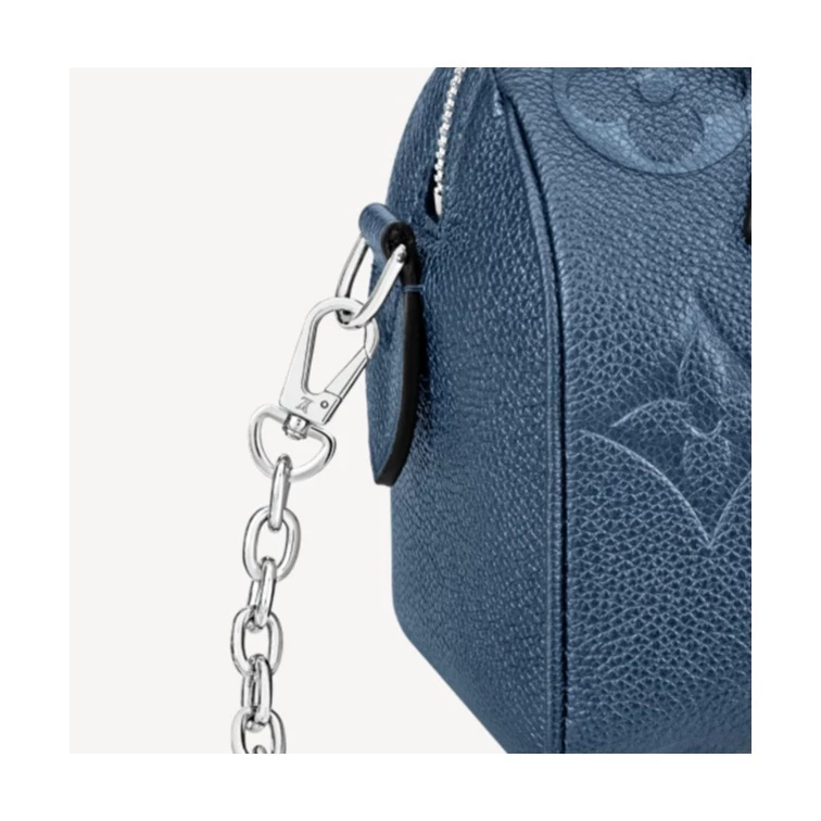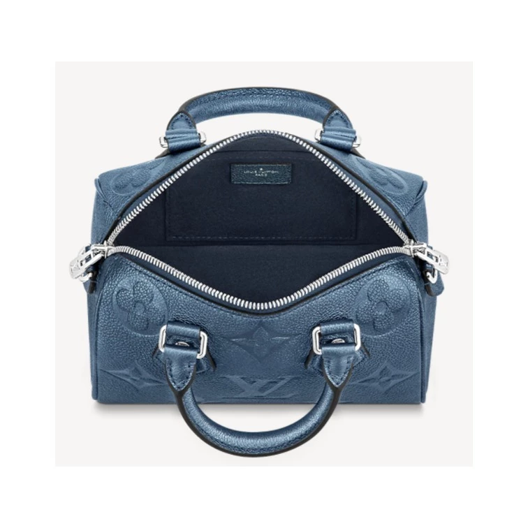 With its singular silhouette, Toron handles and engraved padlock, the adorable Speedy Bandoulière 20 handbag is emblematic of Louis Vuitton’s design traditions. In shimmering and festive navy-blue Monogram Empreinte leather with the Oversized Monogram pattern, it is the perfect contemporary companion. A removable chain-and-leather strap enable shoulder and cross-body carry.